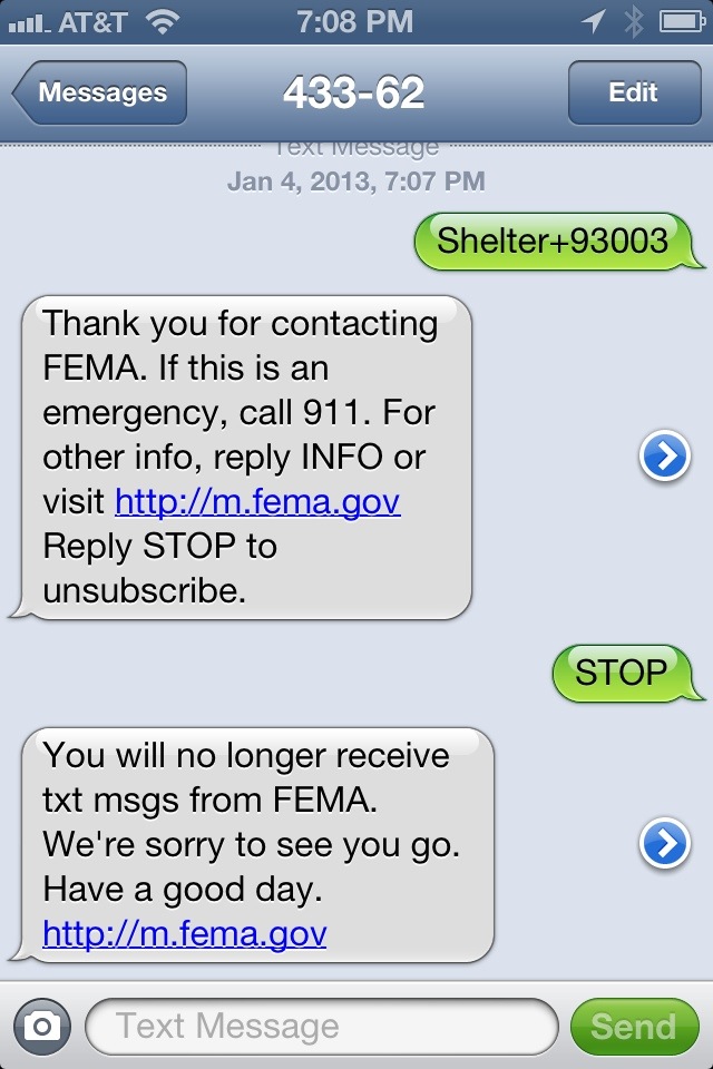 Jan4 i may need to go back to work! Posted on January 4, 2013 by space164 Standard I read somewhere that if you text your zip code and the word SHELTER to a certain number, you would get the address for your nearest fallout shelter. So I tried it. All I got was a connection to FEMA. I immediately opted out. Share this: Click to share on X (Opens in new window) X Click to share on Facebook (Opens in new window) Facebook Like Loading...